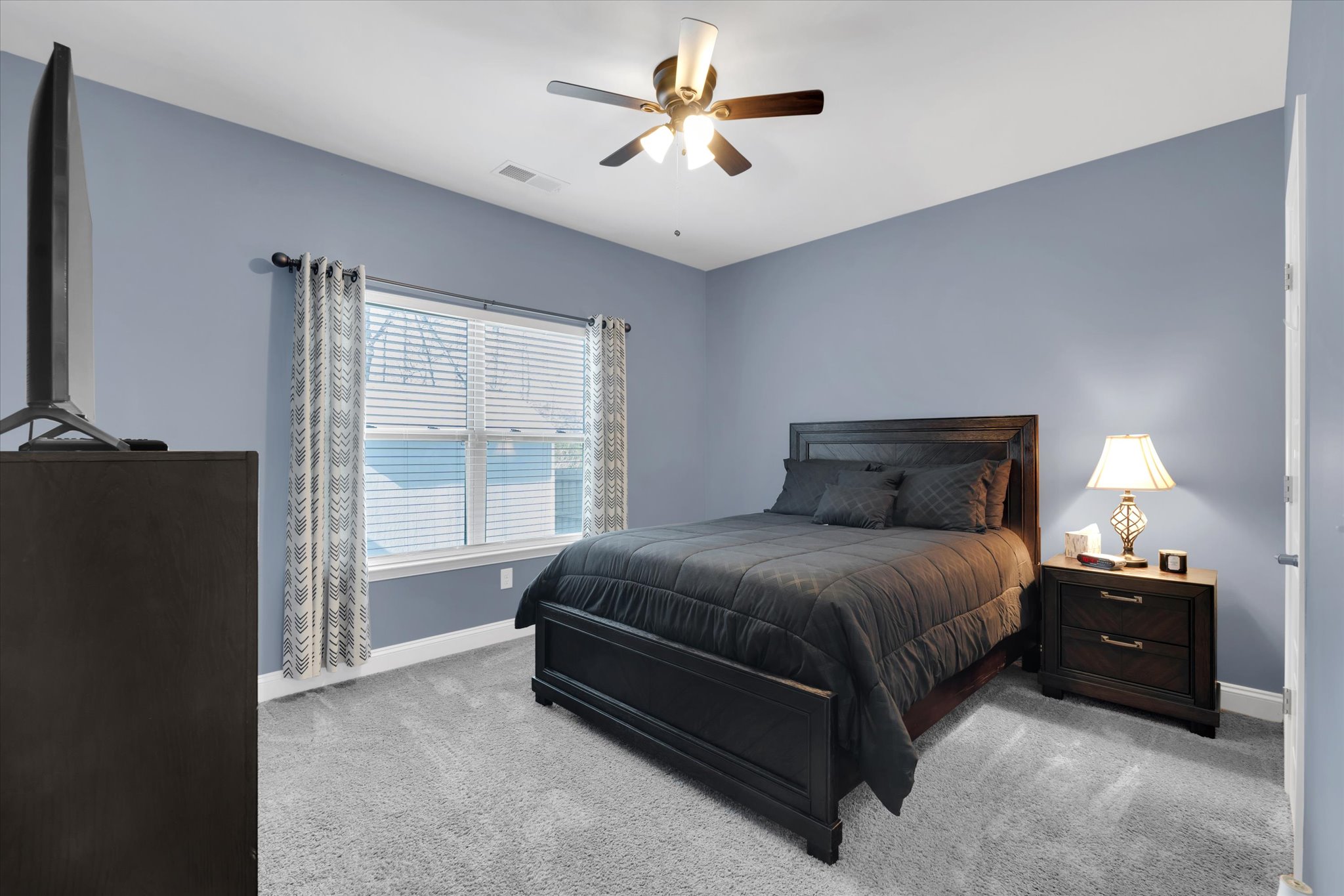 At the center of the home, the open kitchen is designed for both style and functionality. You’ll find granite countertops, a peninsula island with bar seating, stainless steel appliances, a gas range, and a tile backsplash that adds a modern touch. The bright breakfast area and built-in pantry make everyday living convenient and comfortable. Luxury vinyl plank flooring runs throughout the main living spaces, hallways, laundry room, and secondary bath, giving the home a clean and durable finish that’s ideal for busy households.